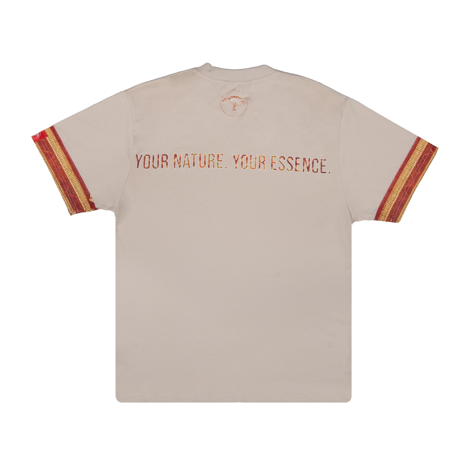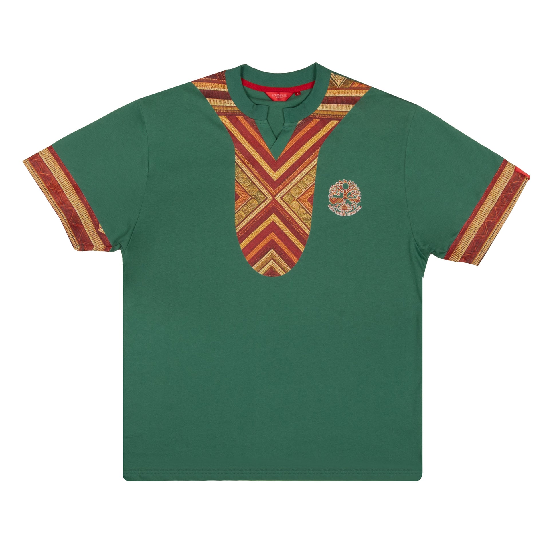 The tee re-imagines the collar of a traditional African shirt: a unique hybrid round–V neck cut, bringing ceremonial heritage into a contemporary silhouette.