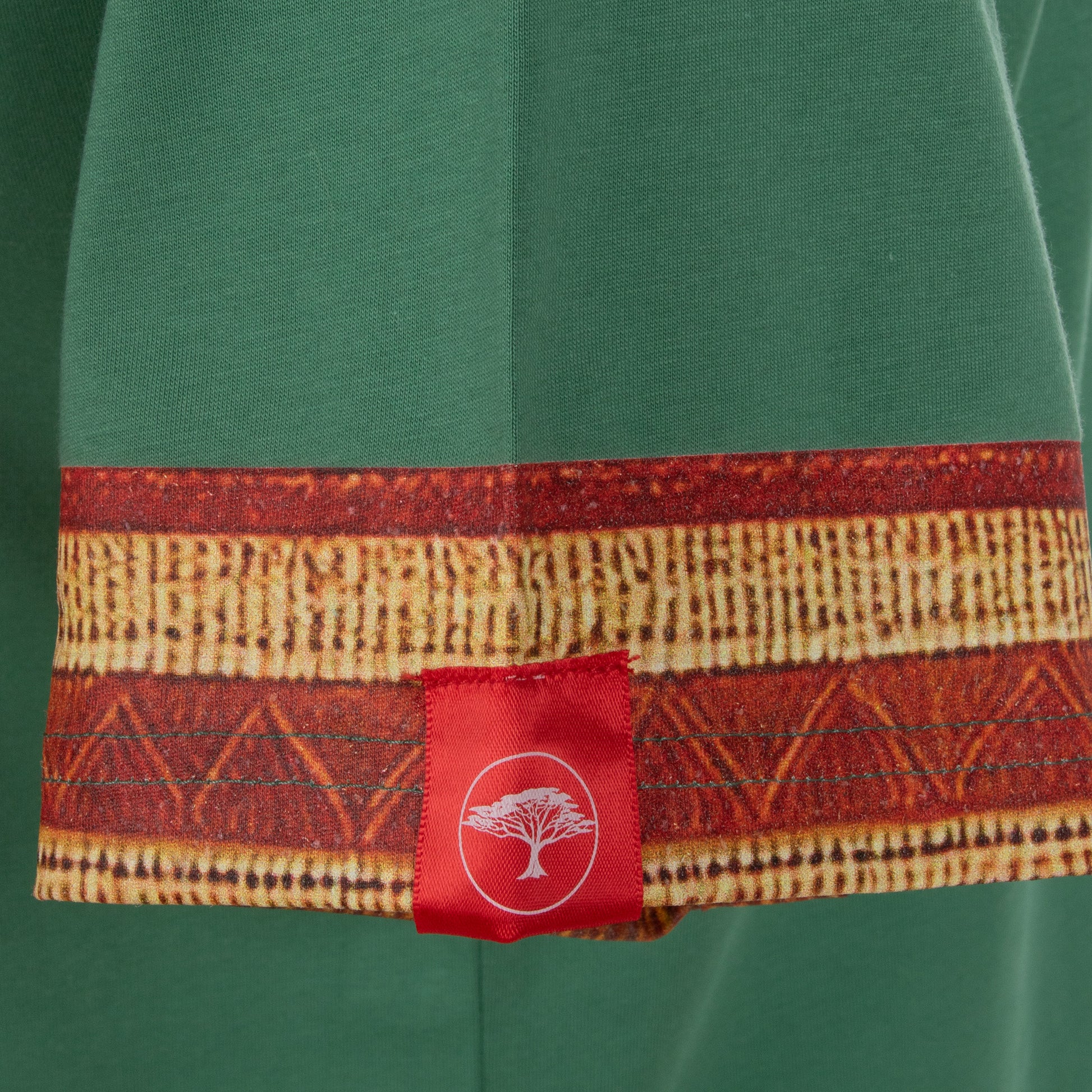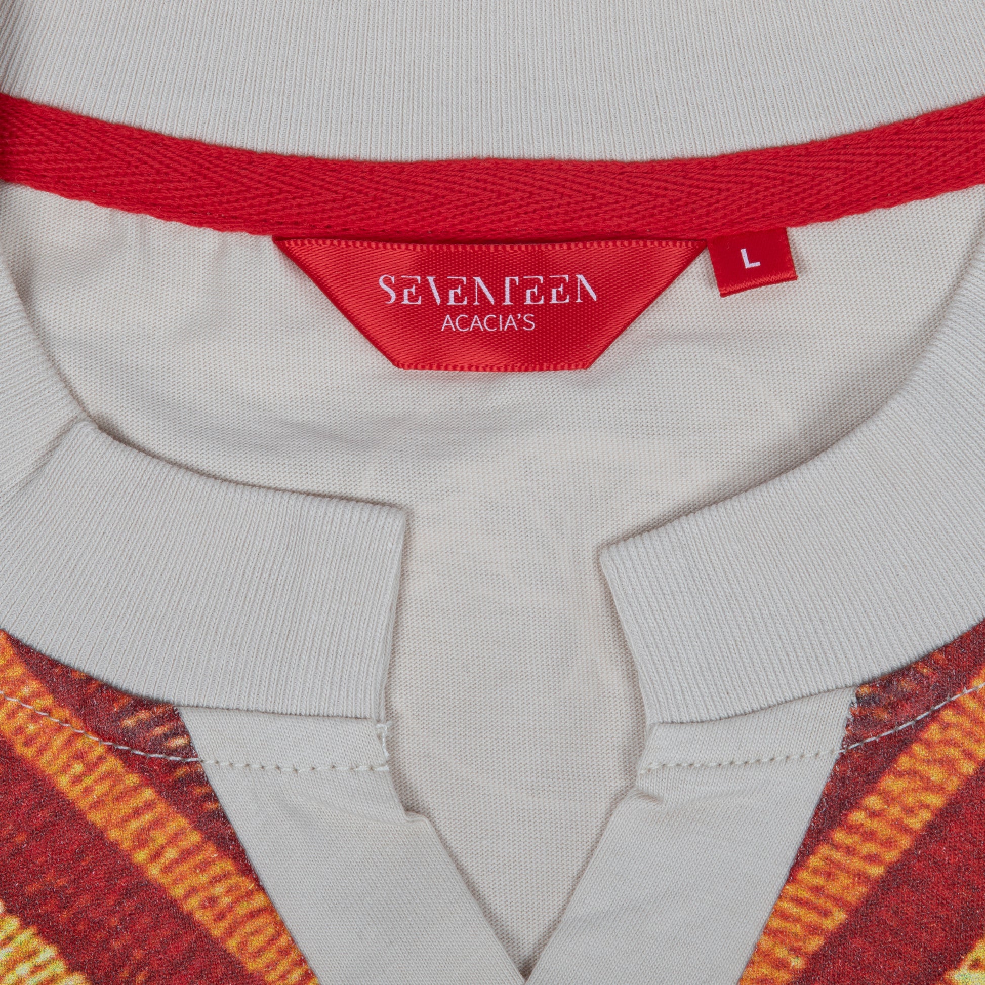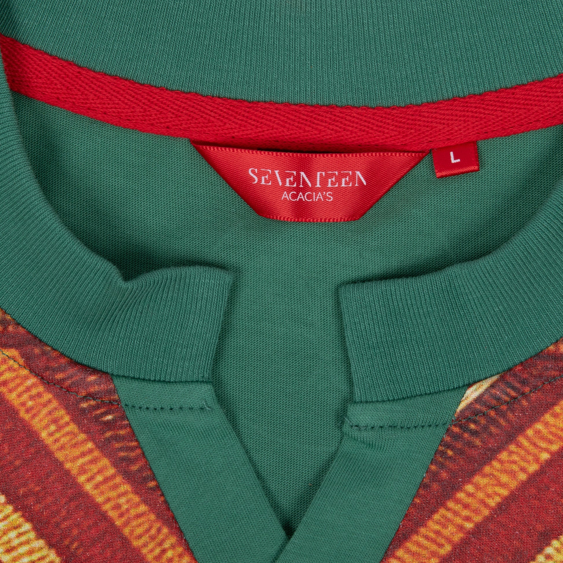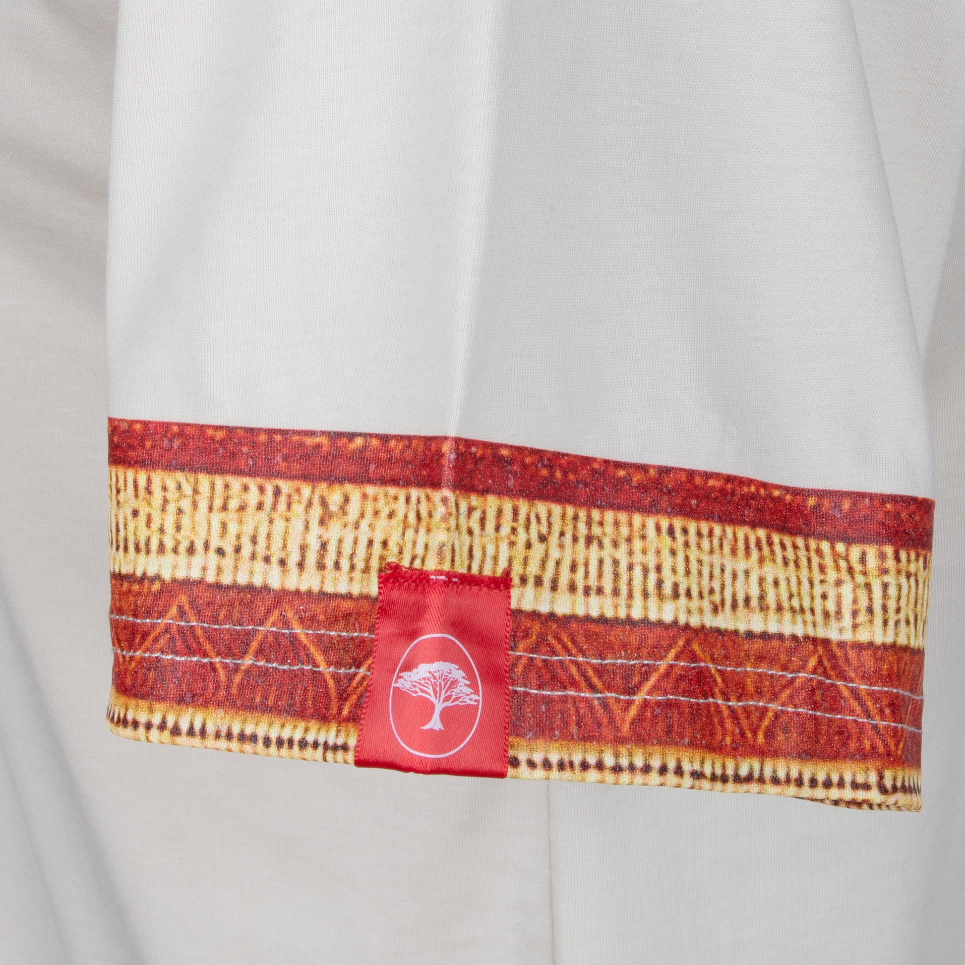 - African-inspired geometric print across chest and sleeve bands in sun-gold and ember-red